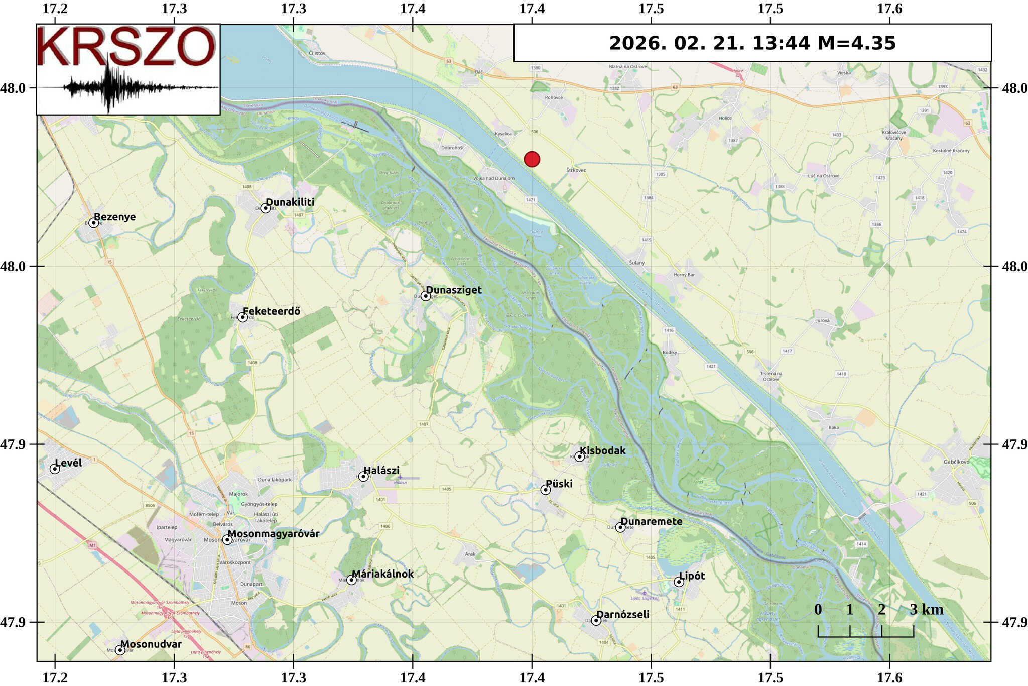 A földmozgást szombaton kora délután regisztrálták. A Kövesligethy Radó Szeizmológiai Obszervatórium előzetes tájékoztatása szerint az epicentrum Mosonmagyaróvártól mintegy 15 kilométerre helyezkedett el, körülbelül 13 kilométeres mélységben.
