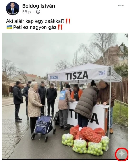 A modern politikai kommunikáció eszköztára az utóbbi években drasztikusan átalakult, és a vizuális tartalomgyártás vált az egyik leghatékonyabb fegyverré. A hét elején Boldog István Facebook-oldalán megjelent bejegyzés pontosan erre a trendre próbált ráerősíteni, azonban a kivitelezés során súlyos hibákat vétettek. A megosztott képen egy Tisza Párt-os stand volt látható, amely körül tömegek gyülekeztek, a földön pedig látványosan elhelyezett krumplis zsákok és almás ládák sorakoztak. A kompozíció egyértelmű üzenete az lett volna, hogy az ellenzéki formáció élelmiszerrel „vásárolja meg” a választók támogatását és aláírásait.